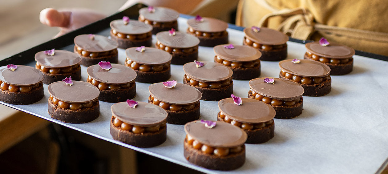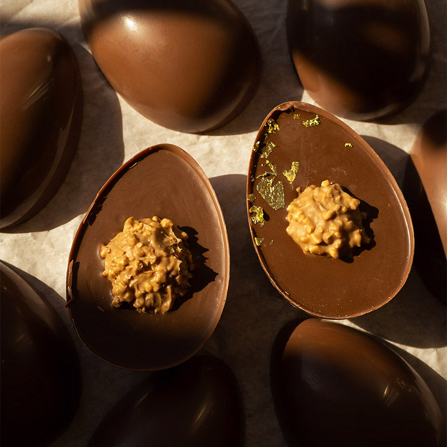 Solid half-egg filled to the brim with gianduja and salted caramel, with a golden caramelised chocolate rocher!